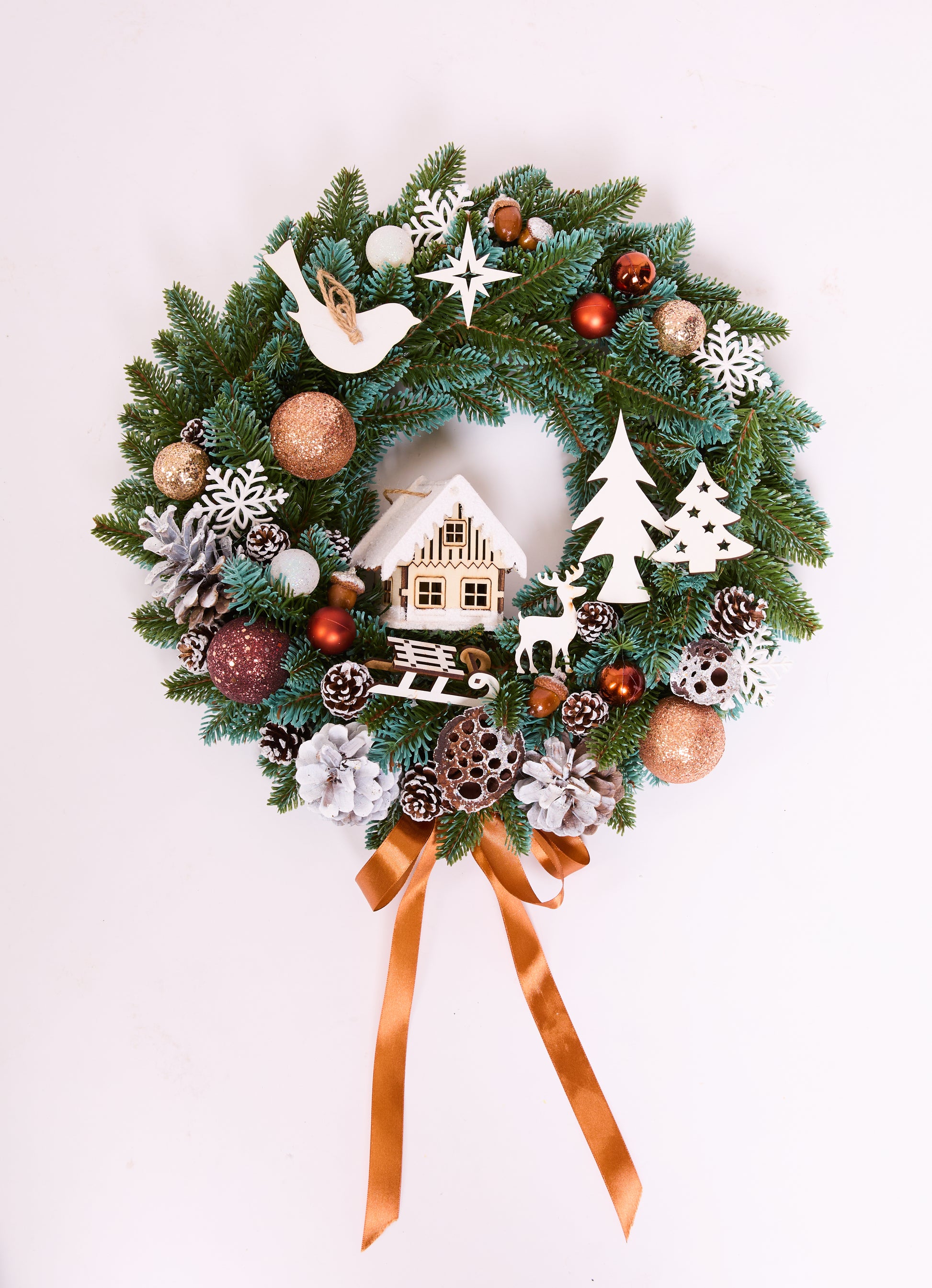 Celebrate the holidays in style with our Christmas wreath with woodland décor, a stunning blend of rustic charm and festive elegance. Made from realistic evergreen branches, this wreath is decorated with frosted pinecones, glittering ornaments, a snowy house, wooden trees, reindeer, and star accents. A warm ribbon bow completes the look, making it perfect for hanging on your front door, walls, or fireplace mantel. This wreath captures the magic of Christmas and adds a welcoming touch to any holiday setting. Durable and reusable, it’s an ideal seasonal decoration for homes, offices, and festive events.