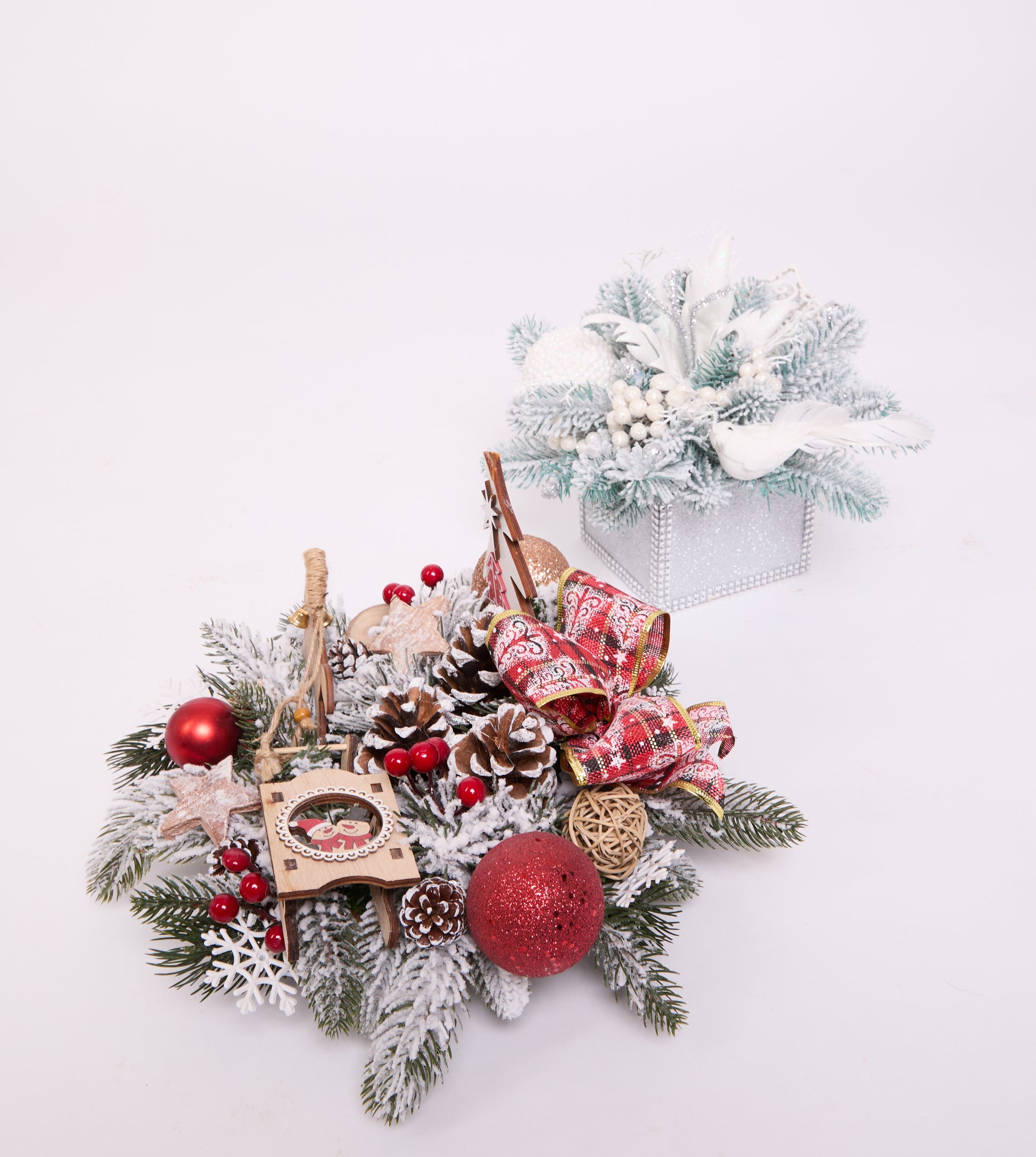 Bring timeless elegance to your holiday celebrations with our Christmas arrangement with white dove. Designed in a sparkling silver box, this festive centerpiece features frosted evergreen branches, shimmering berries, glittering ornaments, and delicate white floral accents. A graceful white dove rests among the snowy greenery, symbolizing peace and harmony, making this piece not only decorative but also meaningful. Perfect as a holiday table centerpiece, mantel decoration, or gift, it combines modern silver tones with natural winter charm. Durable and reusable, this arrangement is ideal for creating a serene and stylish Christmas atmosphere in any home.