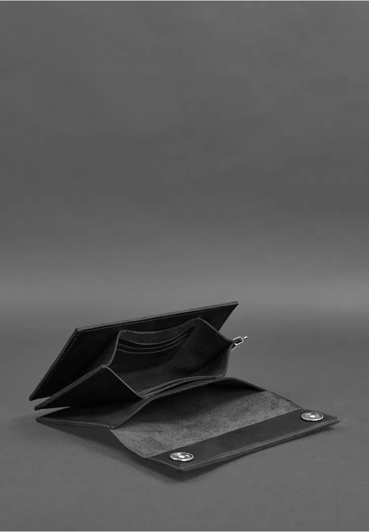 The wallet is made entirely by hand from very durable genuine Crazy Horse leather in black. The accessory is closed with a button flap. There is an additional zip pocket under the flap.