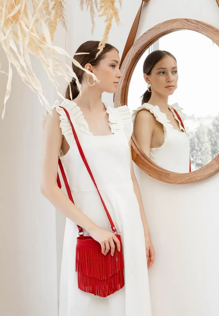 The long fringe will bring lightness and dynamics to the image. And the rich ruby color of the bag will add courage and expression.