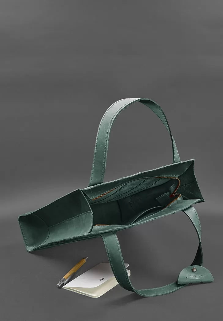 Leather women's shopper Betsy is an ideal option for those who are looking for a roomy bag for every day. The green shopper is made entirely by hand in our workshop. The accessory is made of strips of genuine Crazy Horse leather. Thanks to the special dressing, the surface of the leather is easily and quickly wiped, but it does not spoil it at all, but gives a noble aged look. Crazy Horse is a rather dense, elastic and wear-resistant leather. It has a matte surface and a soft inside.