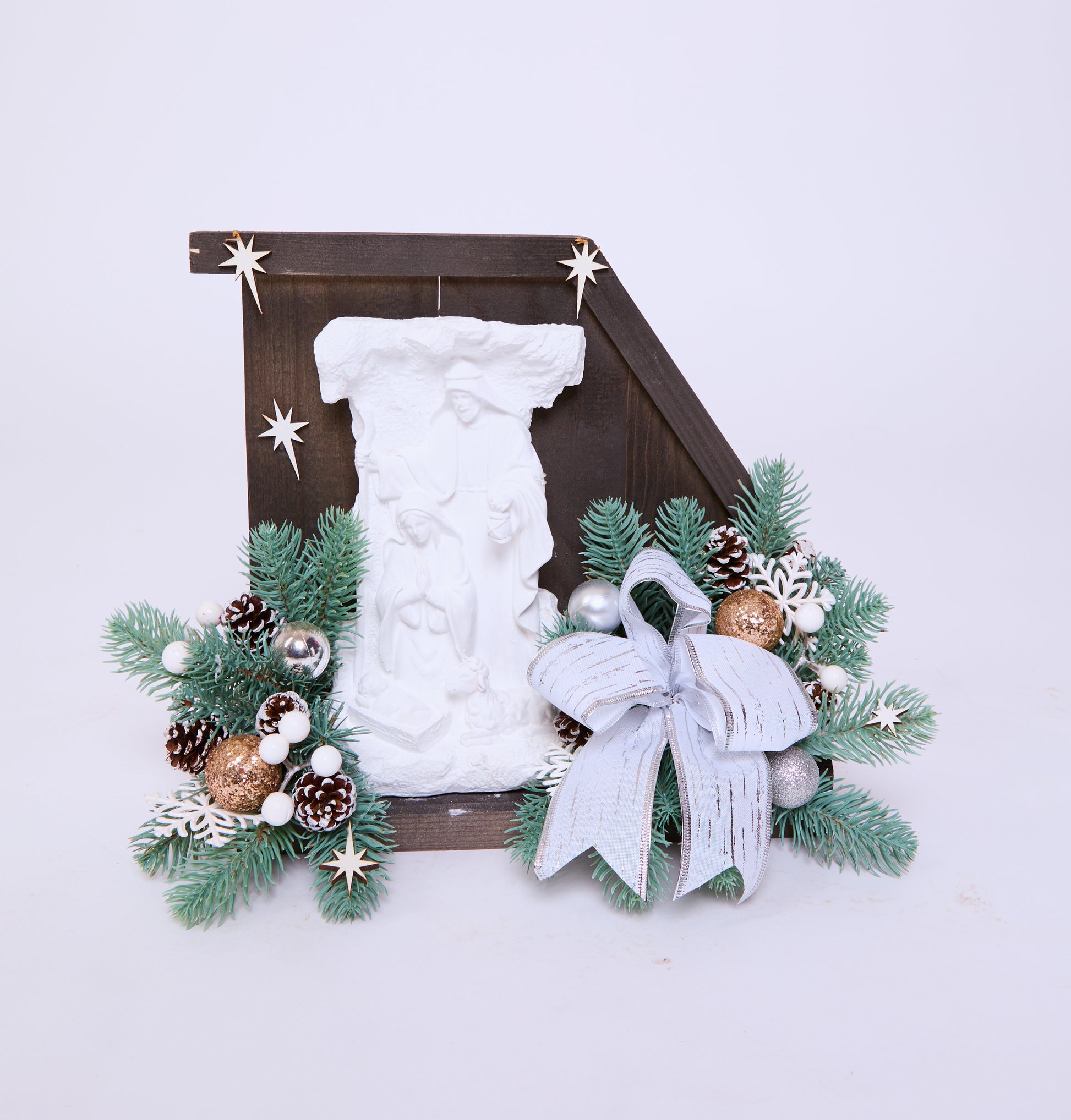 Bring faith and tradition into your holiday décor with our nativity scene Christmas decoration. This rustic wooden display features a white sculpture of the Holy Family set against a wooden frame, surrounded by frosted pinecones, evergreen branches, ornaments, and a large decorative bow. Perfect for placing on tables, shelves, or mantels, this piece adds both spiritual meaning and festive elegance to your Christmas celebrations. Durable and reusable, it’s an excellent choice for church decorations, home displays, or as a thoughtful gift for loved ones during the holiday season.