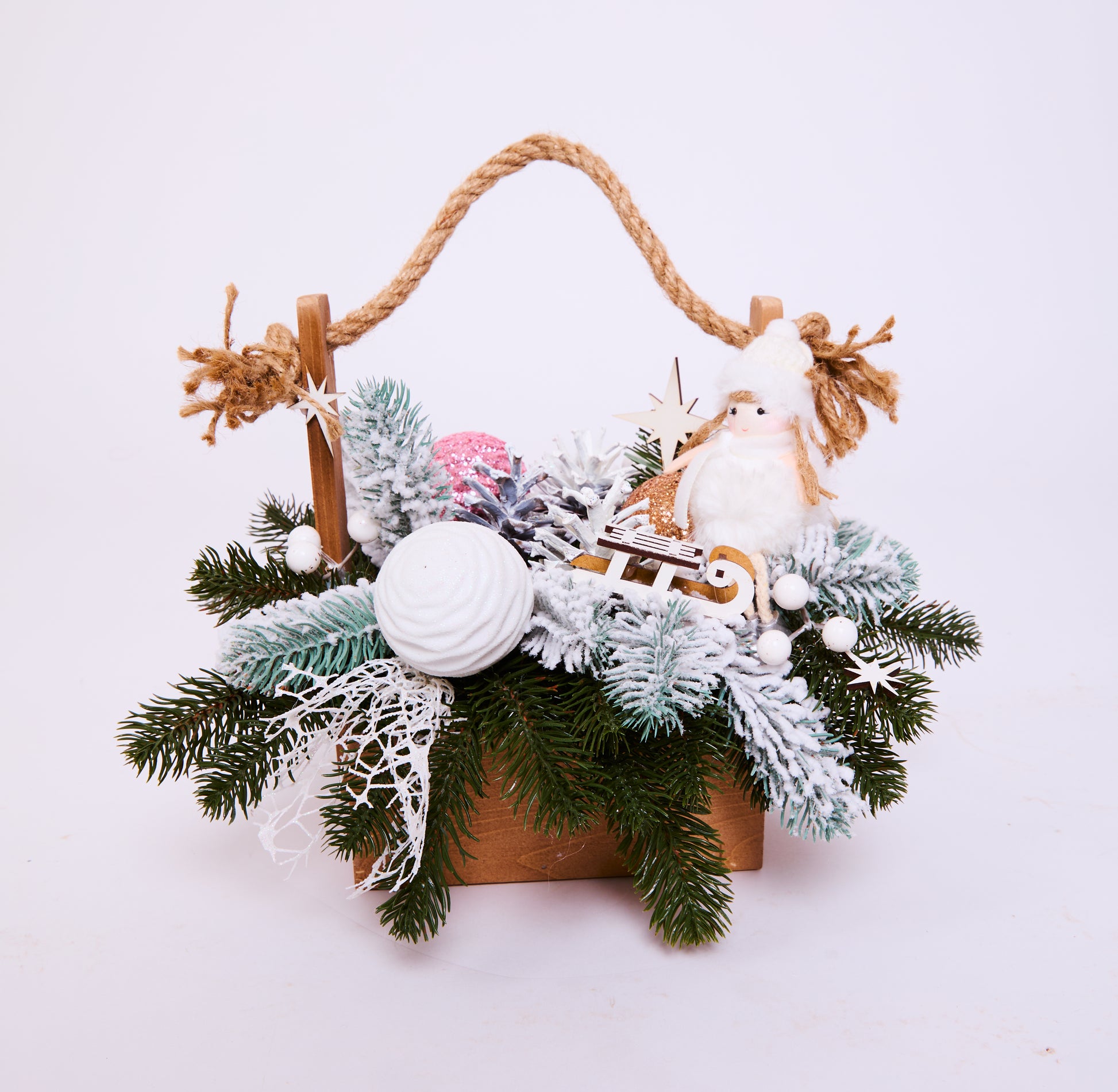 Add warmth and seasonal beauty to your home with our rustic Christmas basket decoration. This handcrafted wooden basket is filled with frosted evergreens, pinecones, glittering ornaments, and a sweet snowman figure on a sleigh. Finished with rustic rope handles and delicate star accents, this arrangement makes a stunning holiday centerpiece for tables, shelves, or mantels. Its woodland-inspired design captures the magic of Christmas and blends perfectly with both traditional and modern holiday décor. Reusable year after year, it also makes a thoughtful gift for loved ones during the festive season.