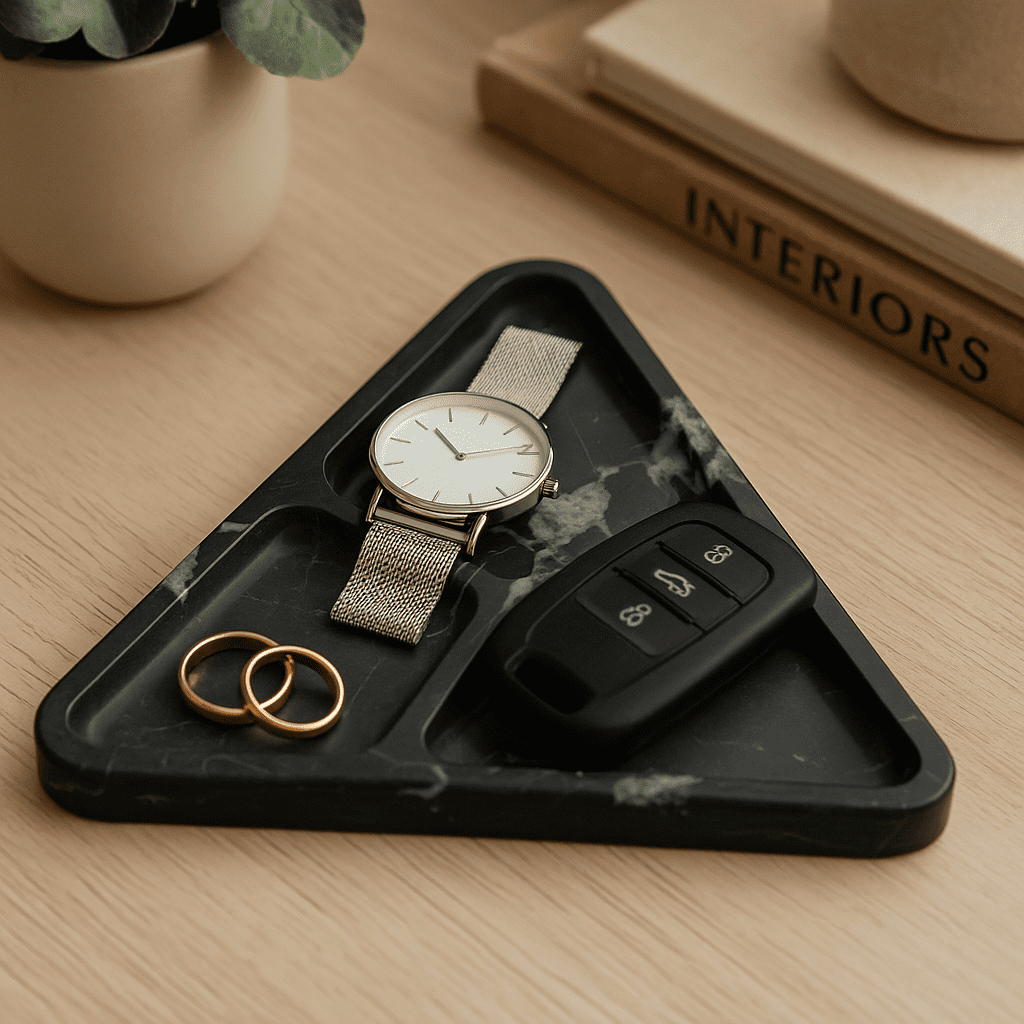 Keep your essentials organized in style with this sleek triangular plate, perfect for holding keys, watches, and other small items. Crafted from durable material with a smooth black finish, this plate offers a modern, minimalistic design that complements any space. Its unique triangular shape adds an elegant touch to your entryway, bedside table, or desk, while ensuring your items are neatly stored and easy to access.