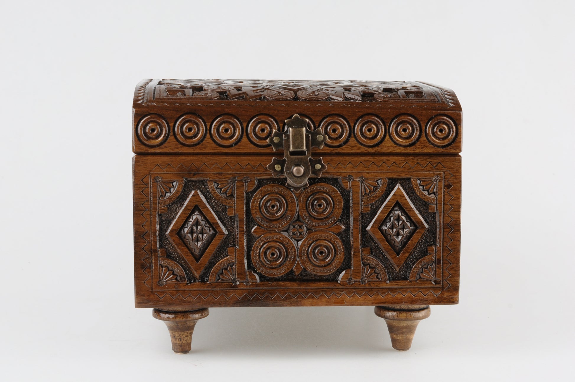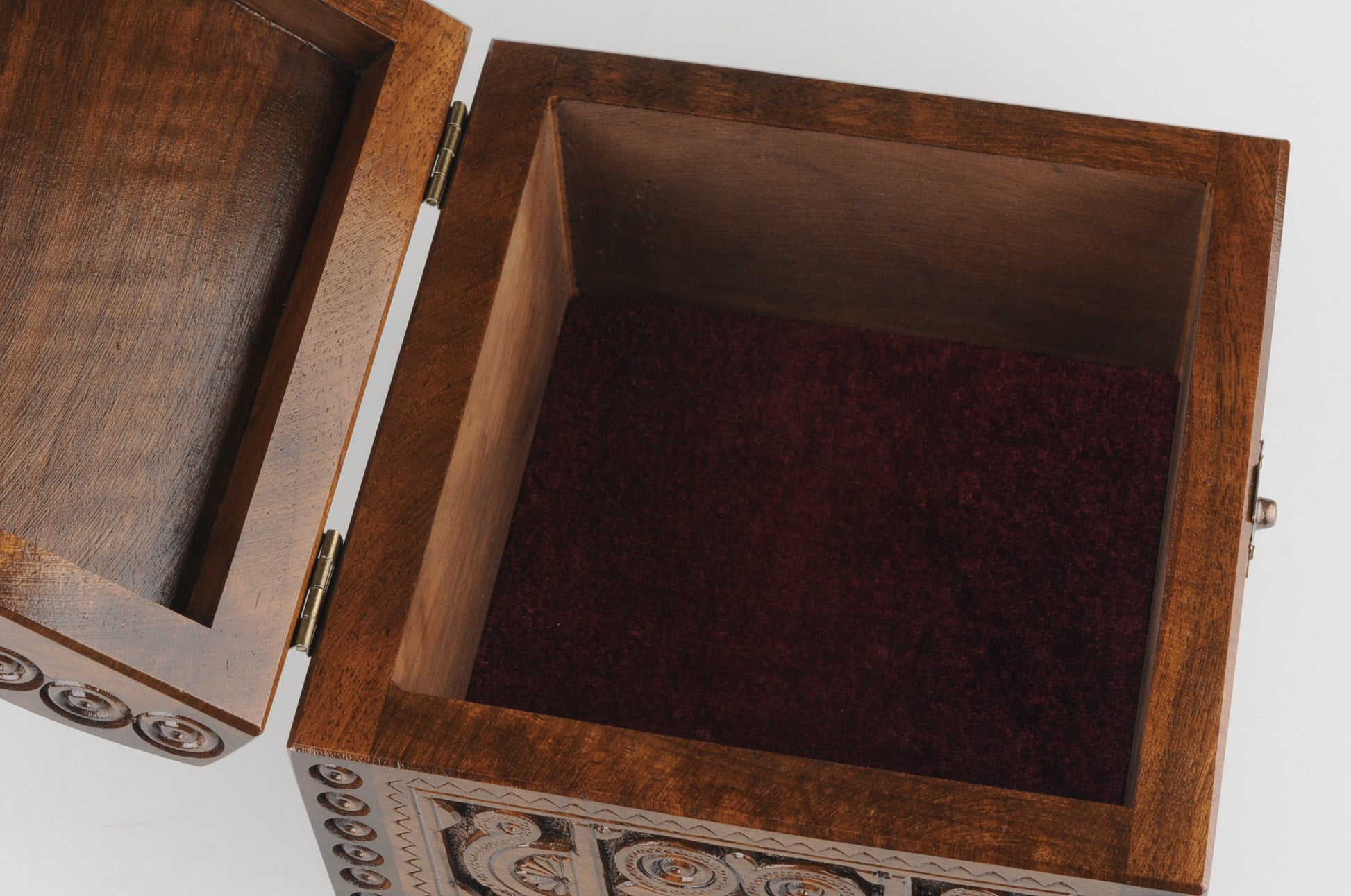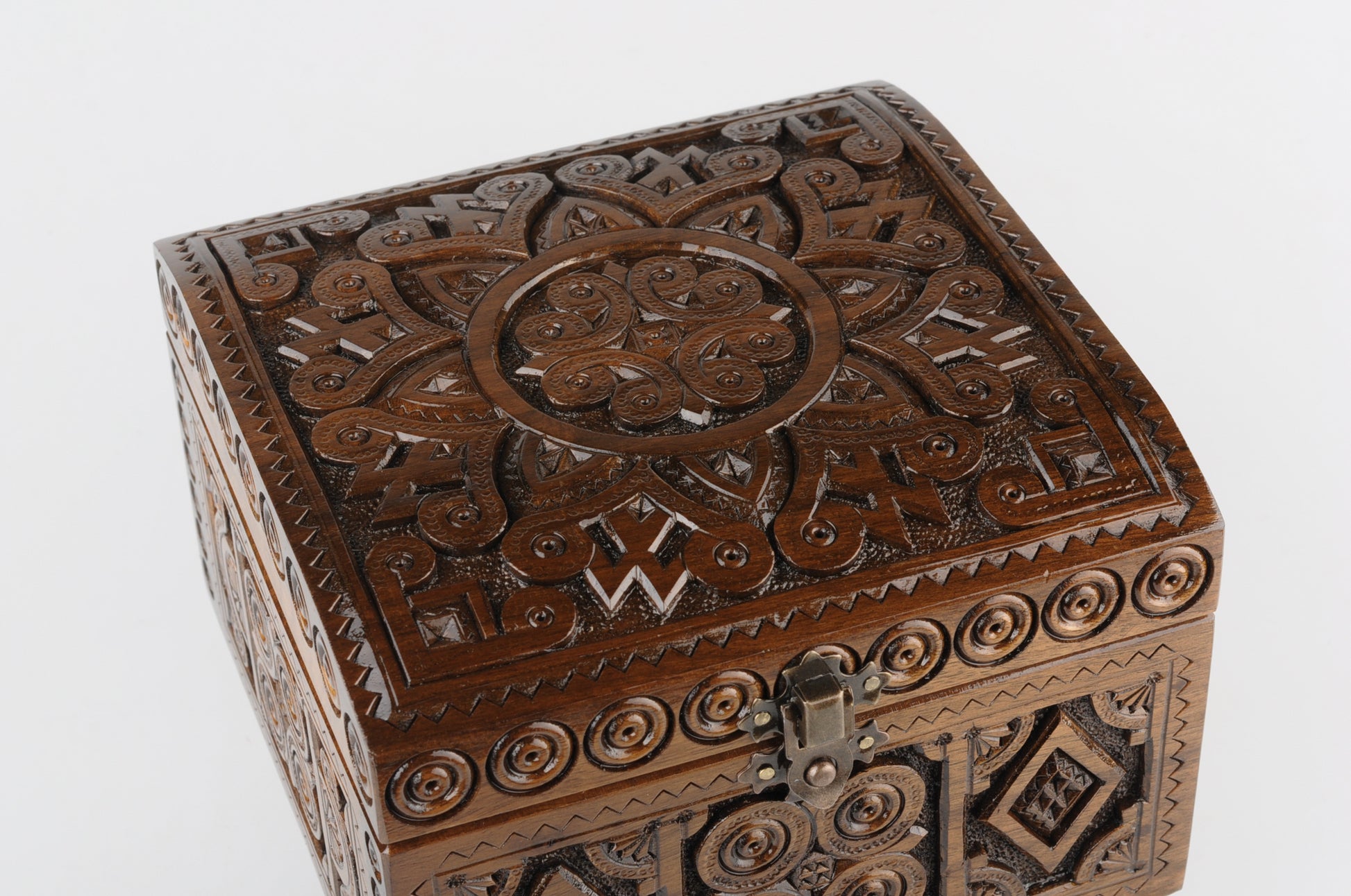 The box is decorated with traditional geometric patterns that create a 3D carved effect and make it unique. It combines practicality and aesthetics, suitable for storing jewelry, keepsakes, or as a stylish interior accent.