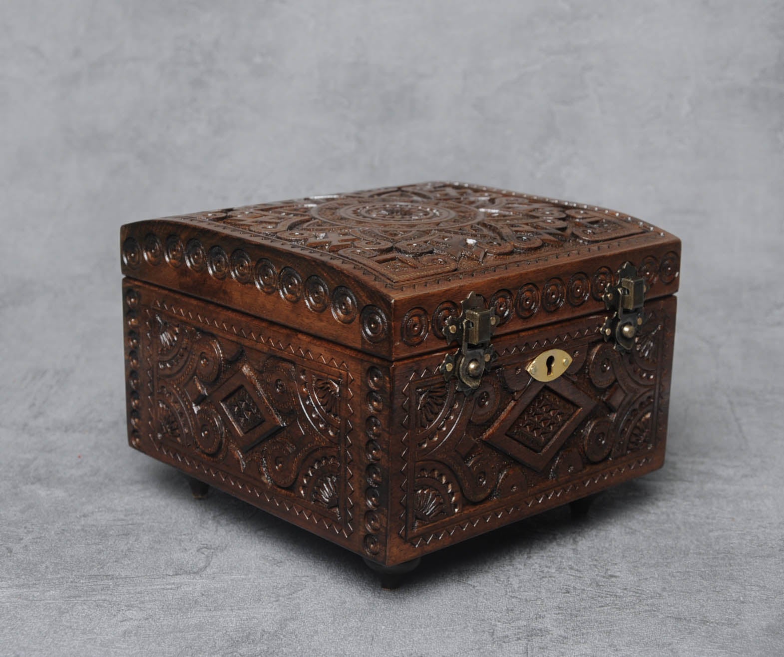 The box is decorated with traditional geometric patterns that create a 3D carved effect and make it unique. It combines practicality and aesthetics, suitable for storing jewelry, keepsakes, or as a stylish interior accent.