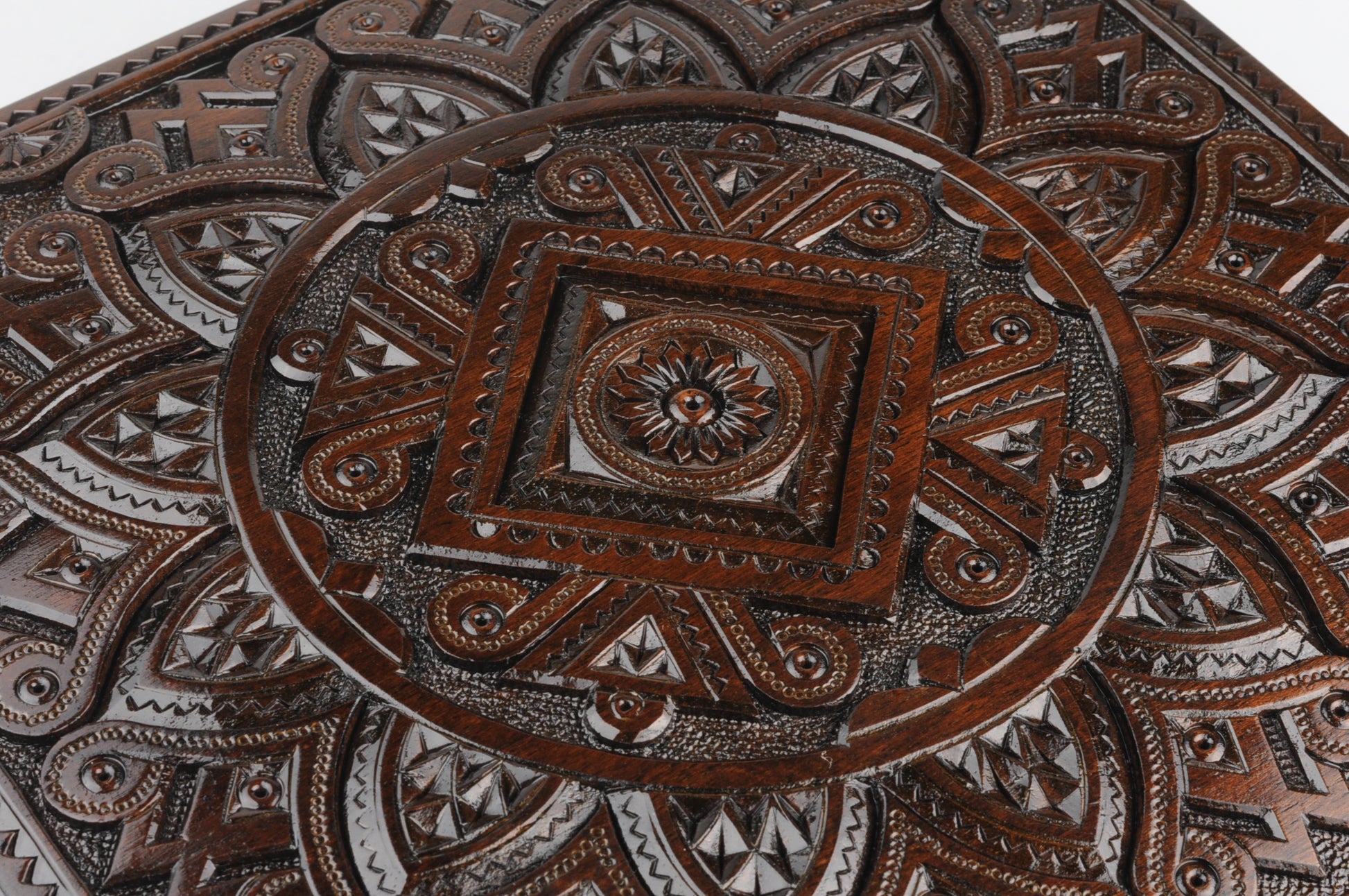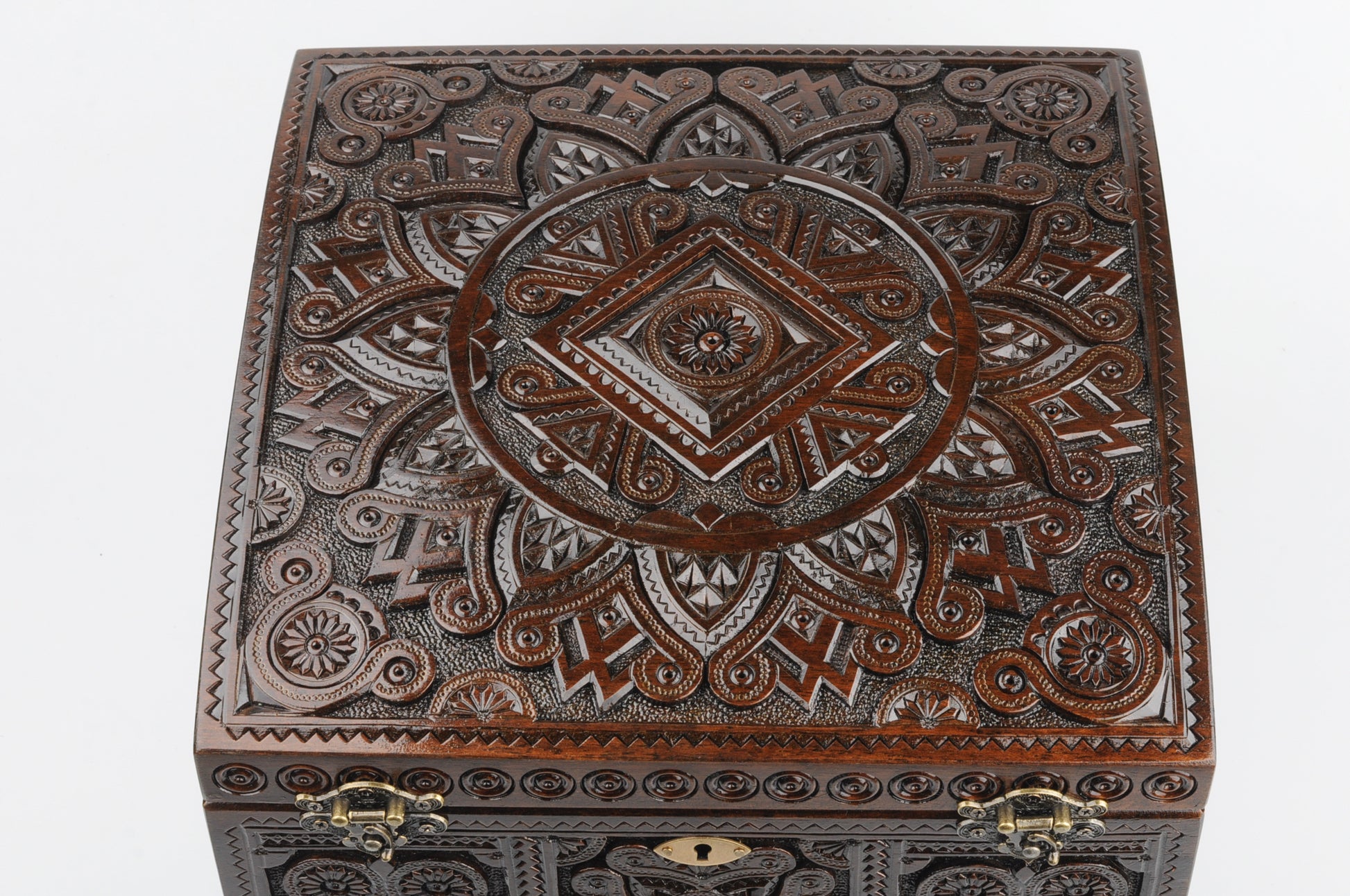 The box is decorated with traditional geometric patterns that create a 3D carved effect and make it unique. It combines practicality and aesthetics, suitable for storing jewelry, keepsakes, or as a stylish interior accent.