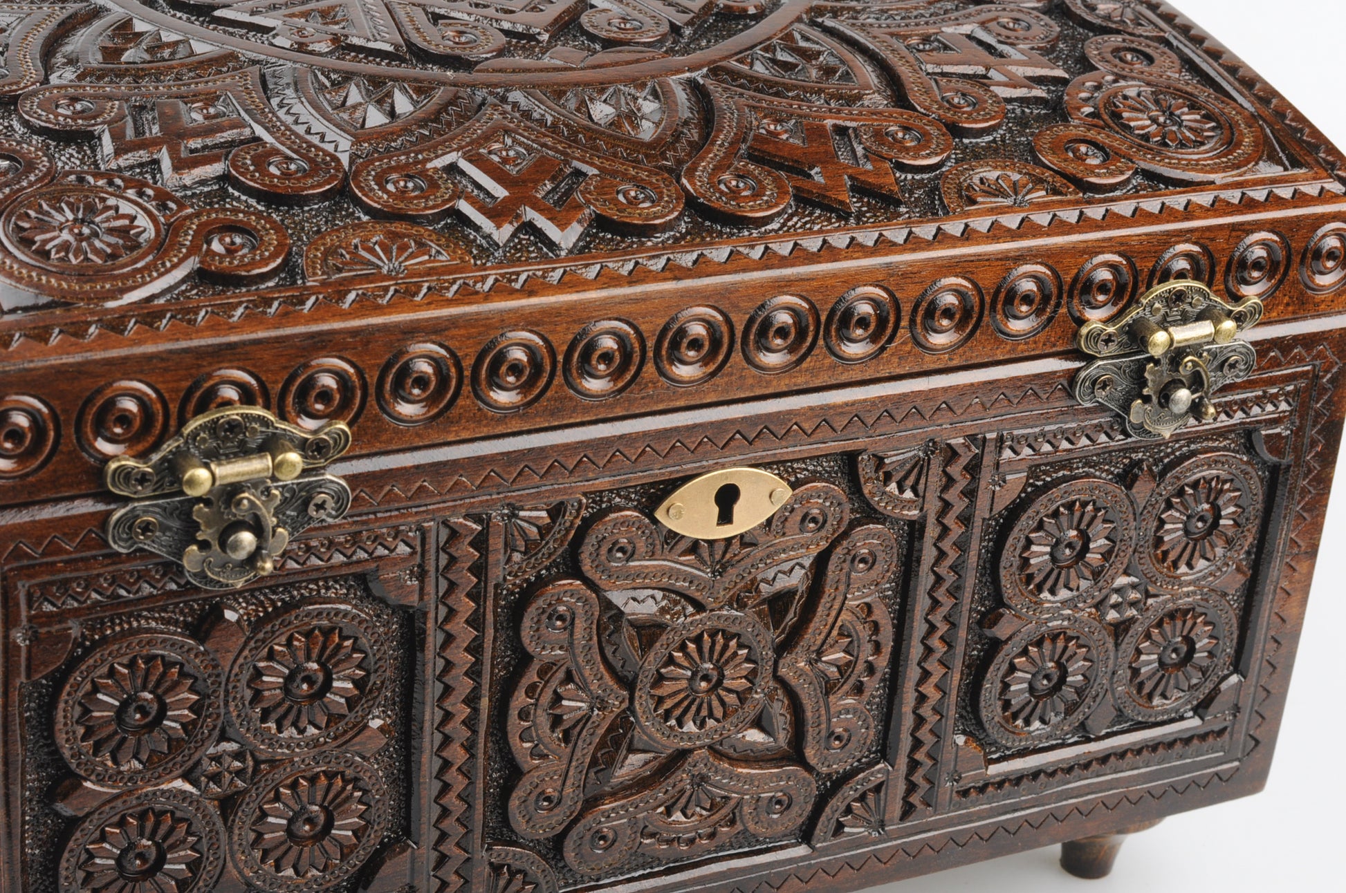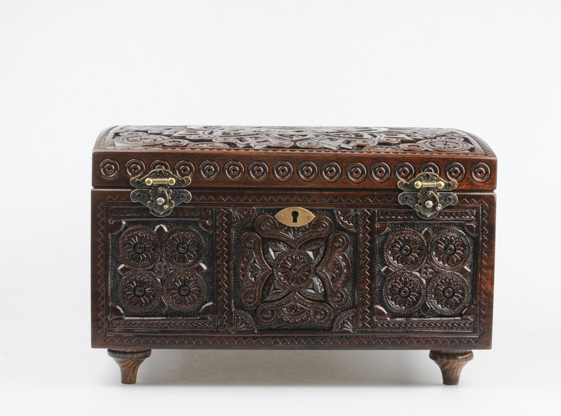 Wooden handmade box with decorative carving. Made of natural wood, the surface is coated with protective varnish that highlights the texture and gives the item an elegant look. Equipped with a secure metal latch, a small key, and stable legs.
